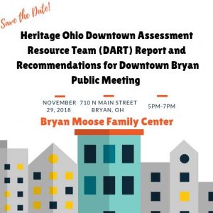 What: Under the sponsorship of the Bryan Development Foundation (BDF), a Downtown Assessment Resource Team (D.A.R.T.) from Heritage Ohio traveled to Bryan and evaluated Bryan’s central business district. The assessment has been conducted and the D.A.R.T. team is ready to return and give a report on their findings. The report is designed to to gain a better understanding of Bryan’s downtown strengths and weaknesses, community wish list, assets and opportunities, as well as kicking off development of a vision, mission and long-range plan for Bryan’s central business district. Please attend the Heritage Ohio Downtown Assessment Resource Team (D.A.R.T.) Report and Recommendations for Downtown Bryan Public Meeting.