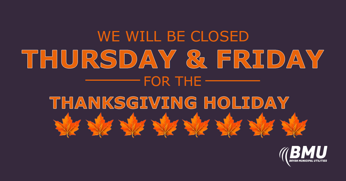 Bryan Municipal Utilities offices will be closed Thursday and Friday in observance of the Thanksgiving holiday.