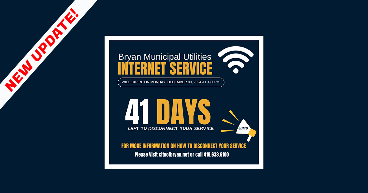 This is a 60-day reminder that Bryan Municipal Utilities internet service will expire on Monday, December 09, 2024, at 4:00 P.M. If you have not switched to another internet provider please do so ASAP. For more information on how to disconnect your service. Please visit www.cityofbryan.net or call 419.633.6100 .