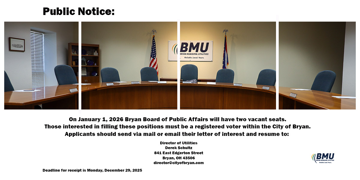 Bryan Municipal Utilities will be closed on Wednesday, December 31st, and Thursday, January 1st, for the New Year holiday. We will reopen on Friday, January 02, 2026, at 8:00 A.M. To report an electric, fiber, or water line break, please call: 419-633-6100 (anytime, day or night) Have a safe and happy New Year.