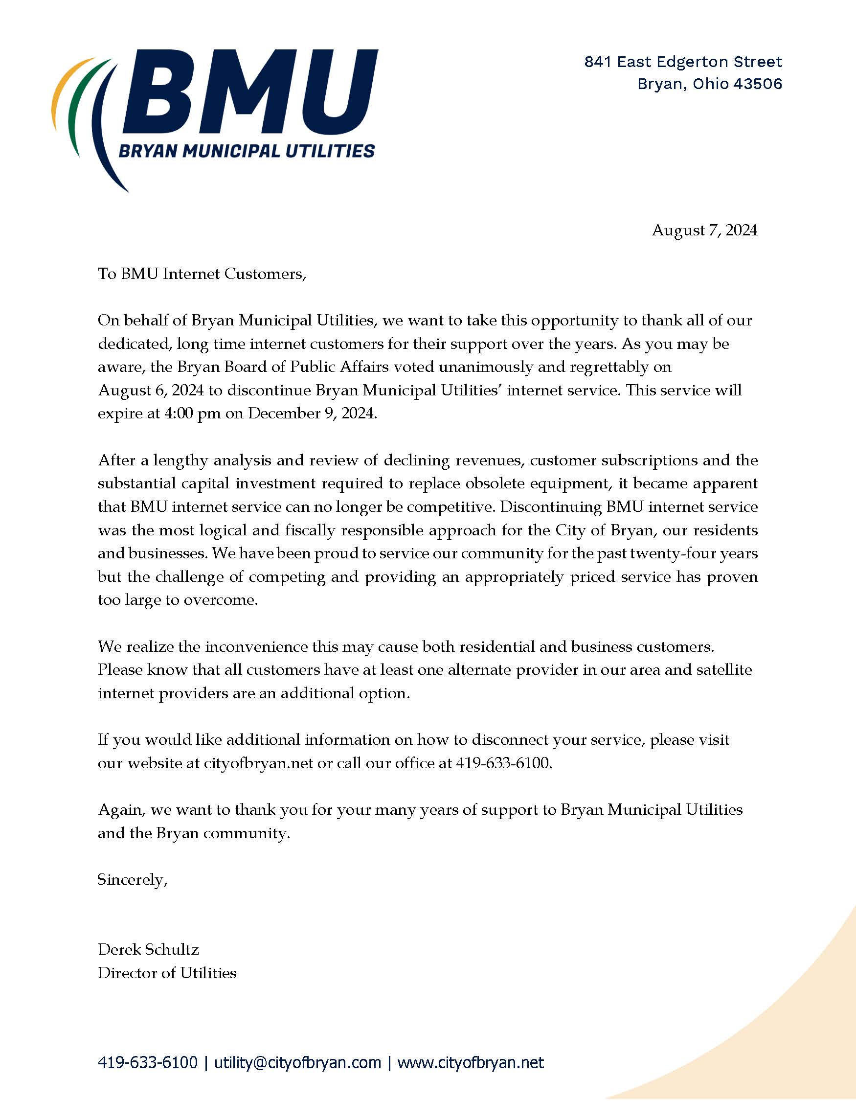 A letter to the BMU Internet Customers from the Director of Utilities, Derek Schultz. BMU2024-10-22T11:22:11-04:00August 7th, 2024| Share This Story, Choose Your Platform! FacebookXRedditLinkedInTumblrPinterestVkEmail