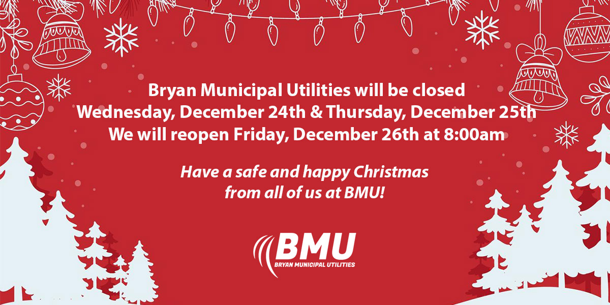 Bryan Municipal Utilities will be closed on Wednesday, December 24th, and Thursday, December 25th, for the Christmas holiday.