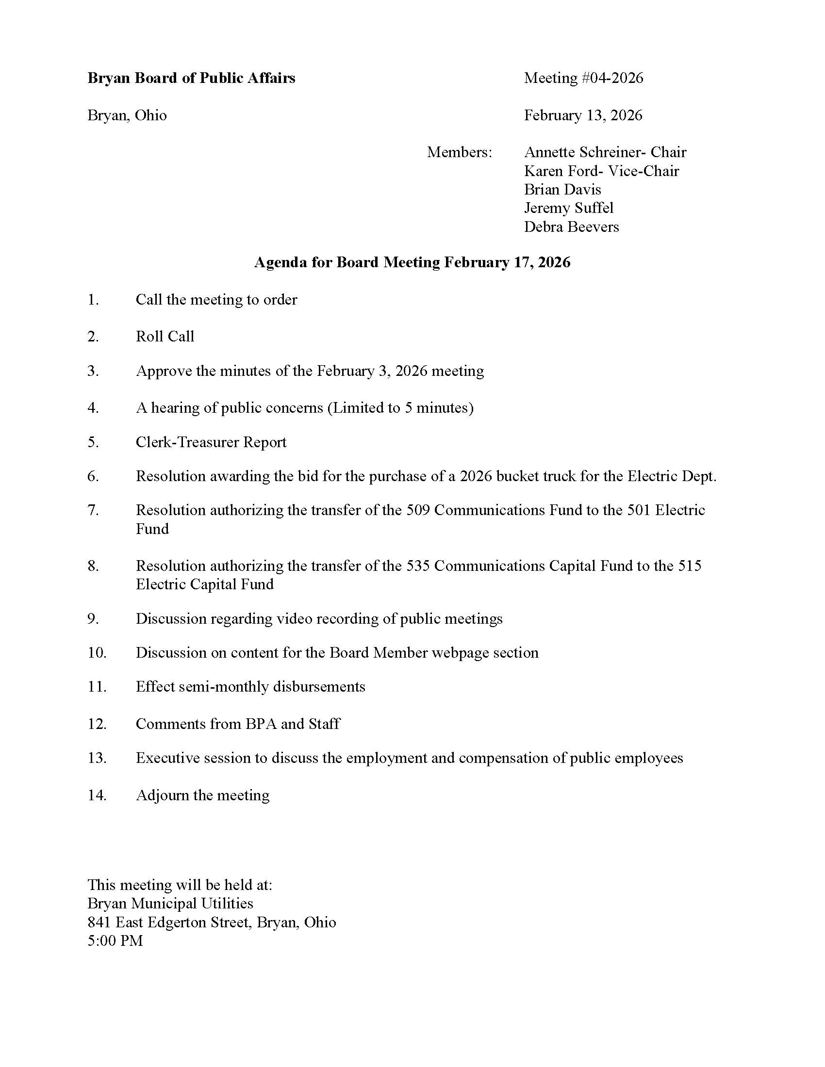 Bryan Board of Public Affairs – Bryan, Ohio – 02/17/2026 – Agenda BPA Agenda for 2026.02.17 Kody McClure2026-02-13T14:49:52-05:00February 13th, 2026| Share This Story, Choose Your Platform! FacebookXRedditLinkedInTumblrPinterestVkEmail