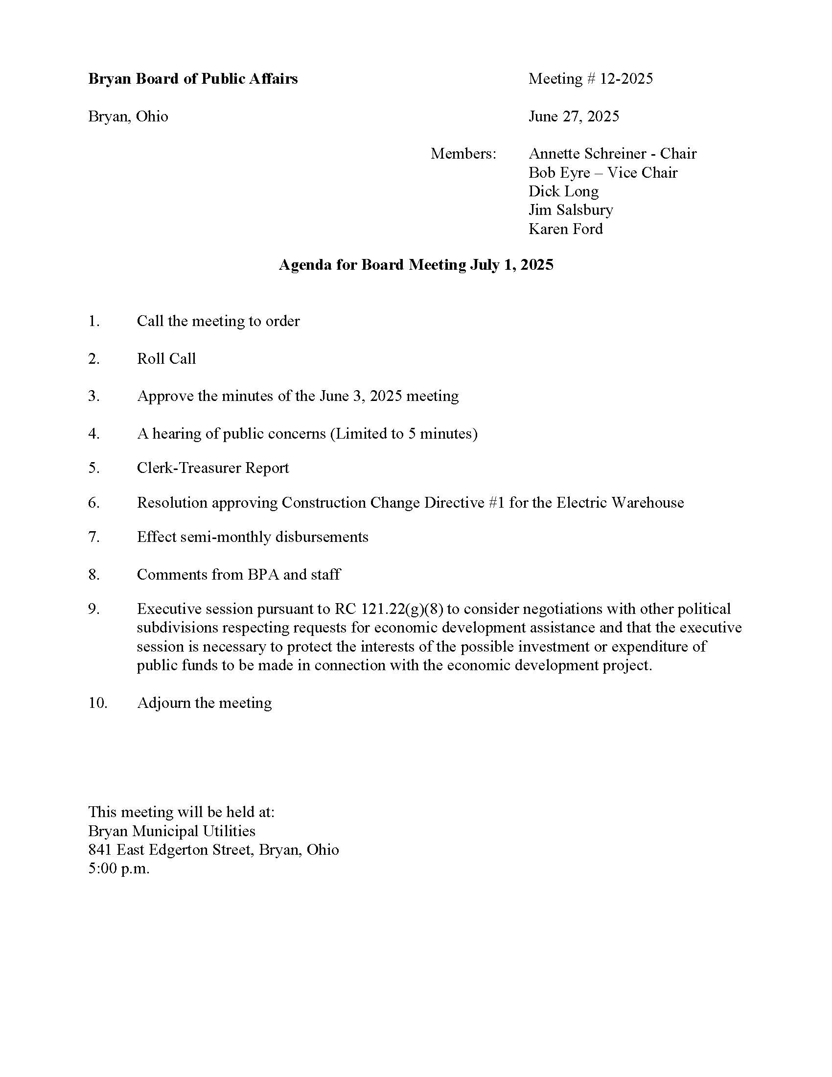 Bryan Board of Public Affairs – Bryan, Ohio – 07/01/2025 – Agenda BMU2025-06-30T10:38:16-04:00June 30th, 2025| Share This Story, Choose Your Platform! FacebookXRedditLinkedInTumblrPinterestVkEmail