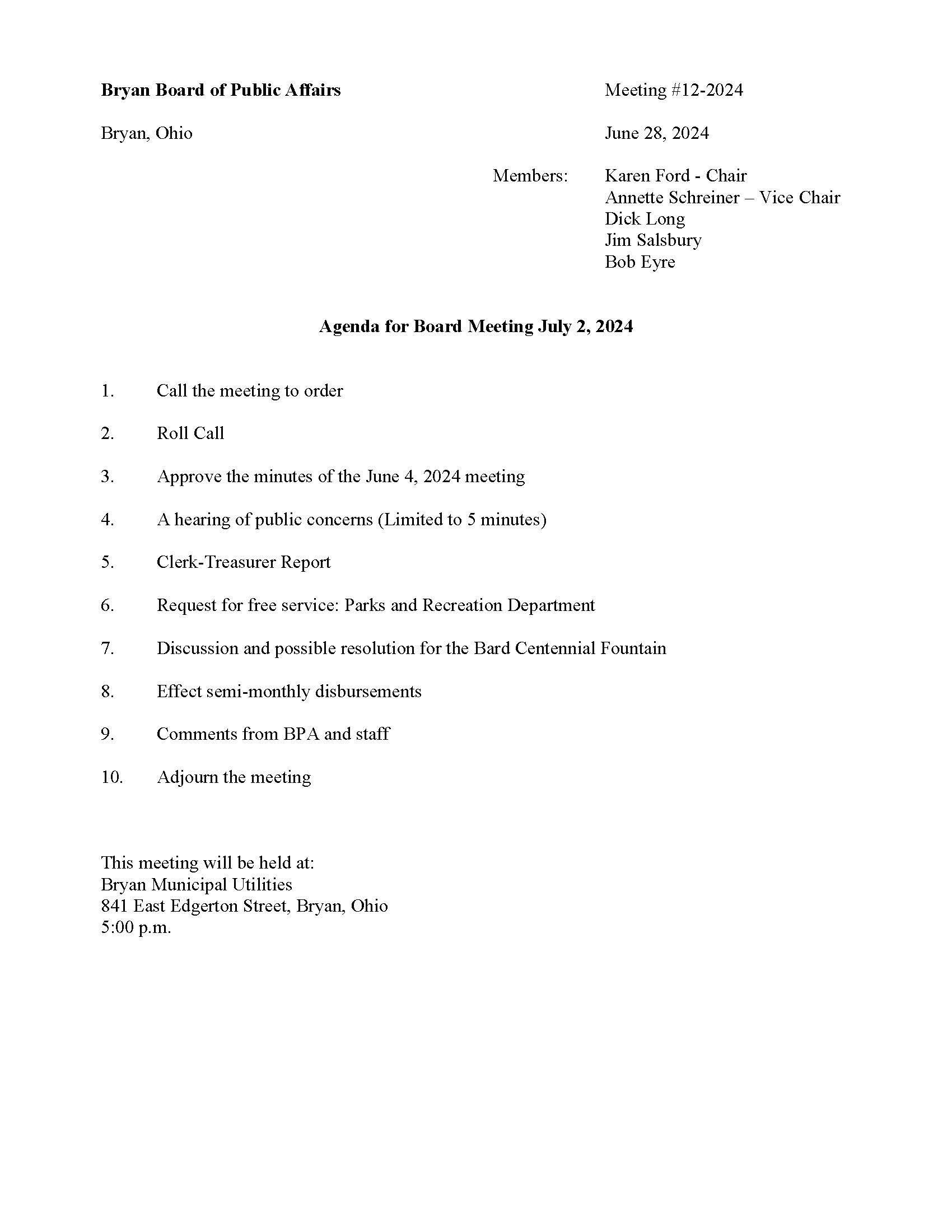 Bryan Board of Public Affairs – Bryan, Ohio – 07/02/2024 – Agenda BMU2024-07-02T03:54:29-04:00July 2nd, 2024| Share This Story, Choose Your Platform! FacebookXRedditLinkedInTumblrPinterestVkEmail