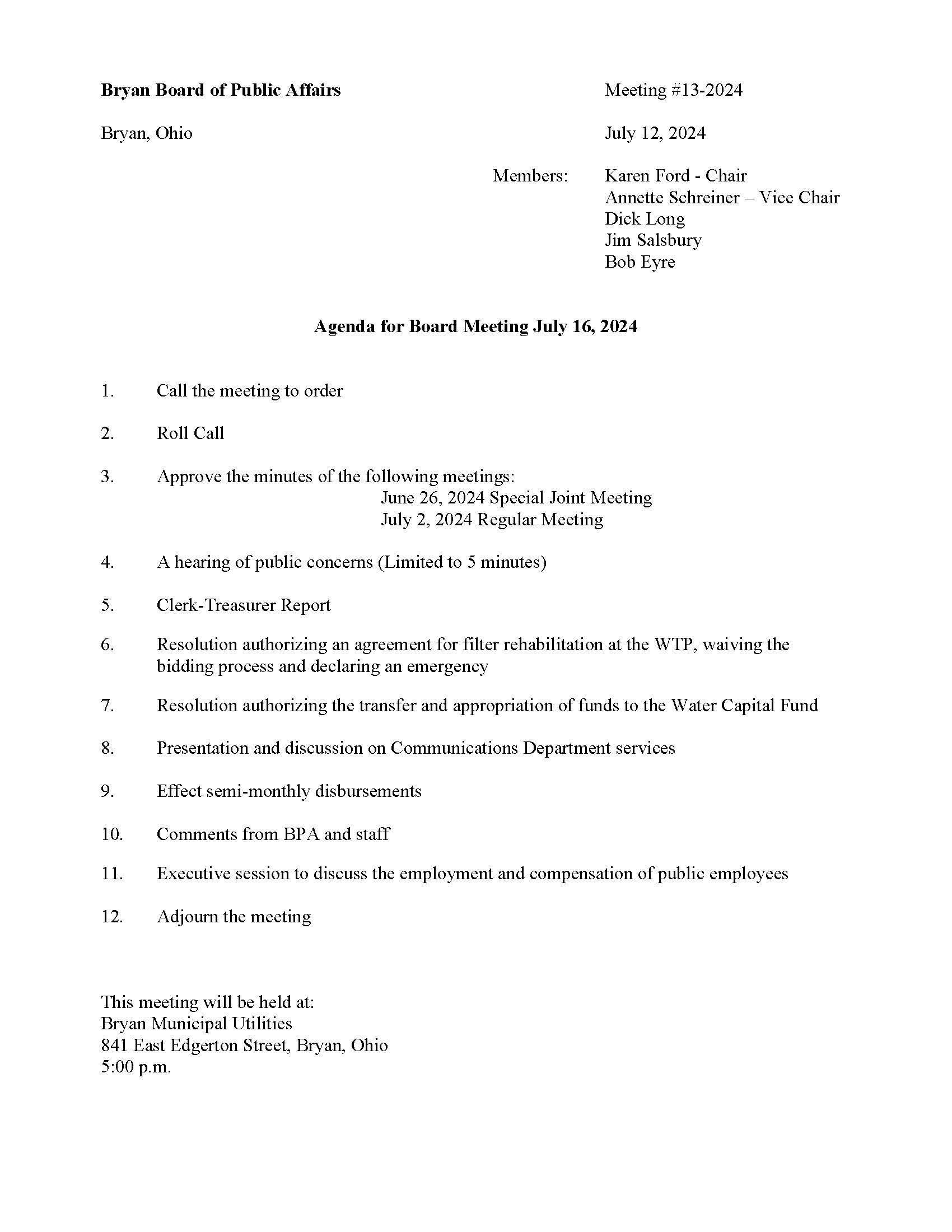Bryan Board of Public Affairs – Bryan, Ohio – July 16, 2024 – Agenda BMU2024-07-12T15:38:06-04:00July 12th, 2024| Share This Story, Choose Your Platform! FacebookXRedditLinkedInTumblrPinterestVkEmail
