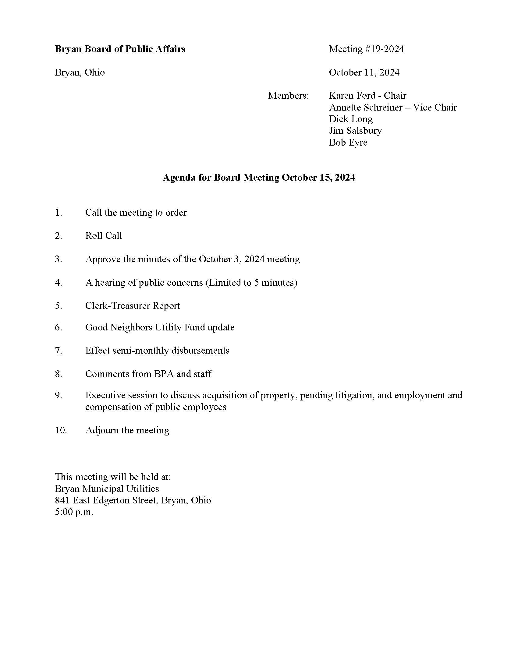Bryan Board of Public Affairs – Bryan, Ohio – October 15, 2024 – Agenda BMU2024-10-15T08:58:12-04:00October 15th, 2024| Share This Story, Choose Your Platform! FacebookXRedditLinkedInTumblrPinterestVkEmail