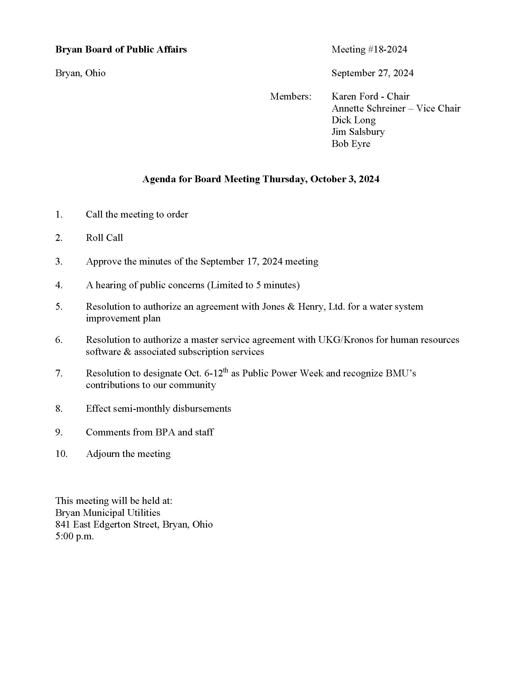 Bryan Board of Public Affairs – Bryan, Ohio – October 3, 2024 – Agenda BMU2024-09-30T14:22:36-04:00September 30th, 2024| Share This Story, Choose Your Platform! FacebookXRedditLinkedInTumblrPinterestVkEmail