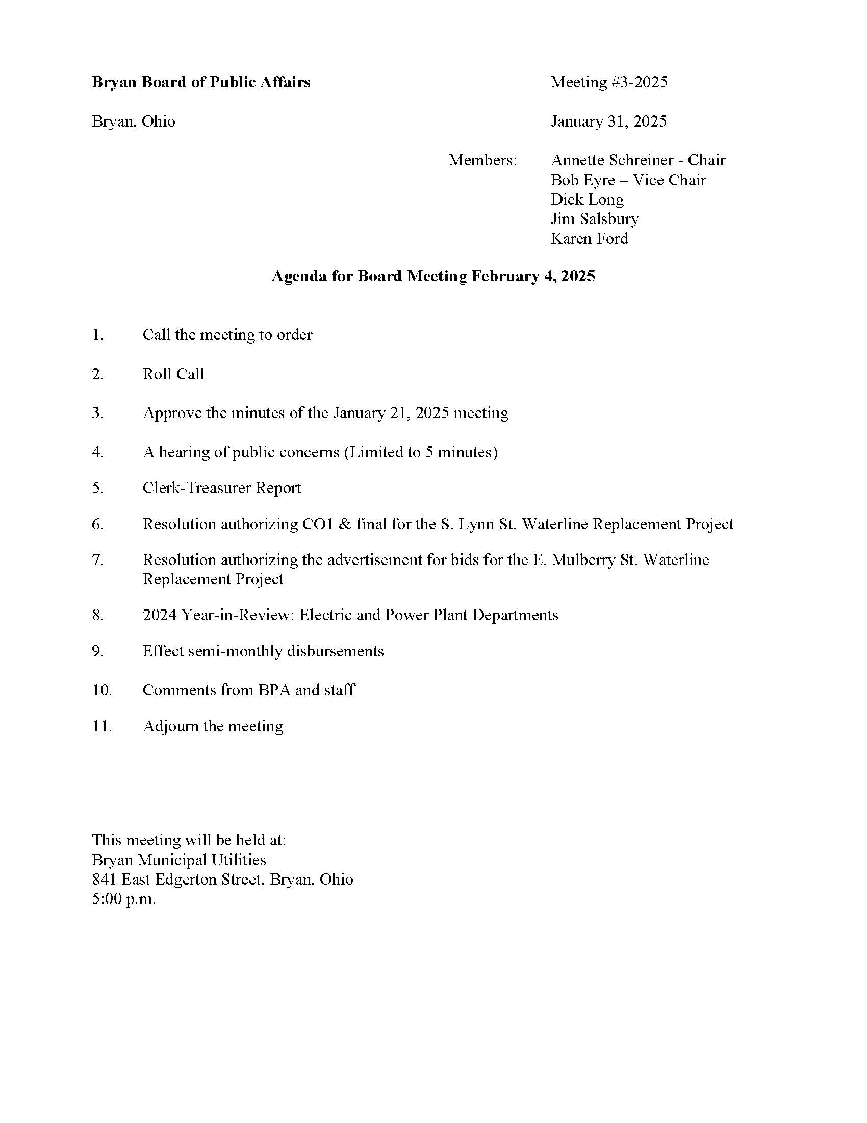 Bryan Board of Public Affairs Meeting – Bryan, Ohio – 02/04/2025 – Agenda BMU2025-01-31T11:32:37-05:00January 31st, 2025| Share This Story, Choose Your Platform! FacebookXRedditLinkedInTumblrPinterestVkEmail