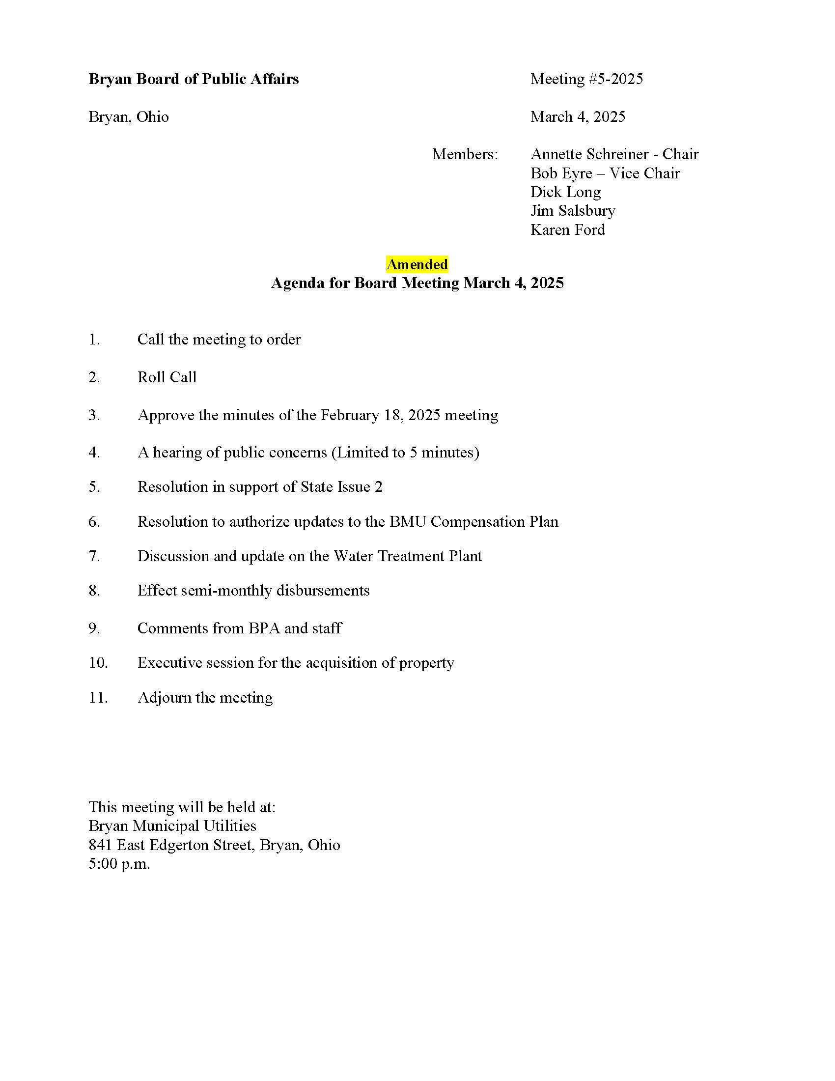 Bryan Board of Public Affairs Meeting – Bryan, Ohio – 03/04/2025 – AMENDED Agenda BMU2025-03-12T13:44:36-04:00February 28th, 2025| Share This Story, Choose Your Platform! FacebookXRedditLinkedInTumblrPinterestVkEmail