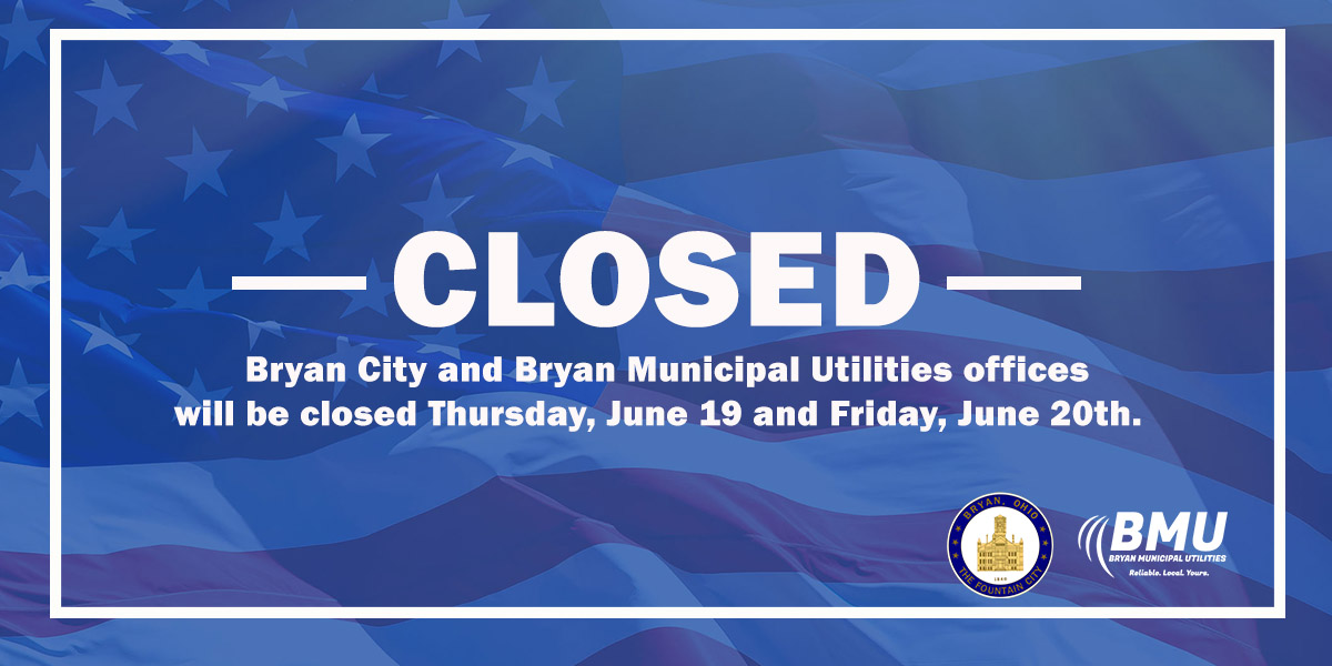Bryan City and Bryan Municipal Utilities offices will be closed Thursday, June 19 and Friday, June 20th. BMU2025-06-18T12:47:58-04:00June 18th, 2025| Share This Story, Choose Your Platform! FacebookXRedditLinkedInTumblrPinterestVkEmail