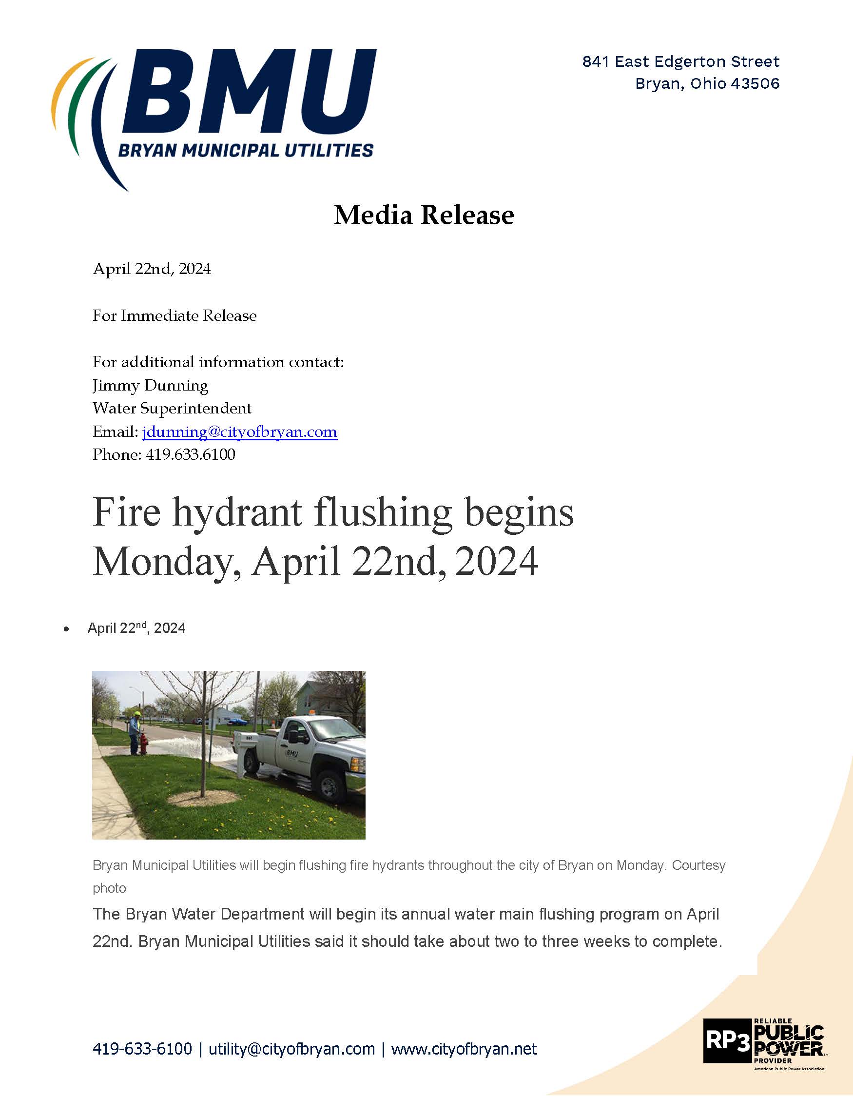 Fire Hydrant Flushing Begins Monday, April 22nd, 2024 BMU2024-04-18T15:24:08-04:00April 18th, 2024| Share This Story, Choose Your Platform! FacebookXRedditLinkedInTumblrPinterestVkEmail