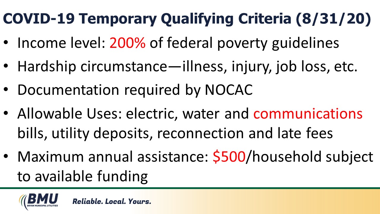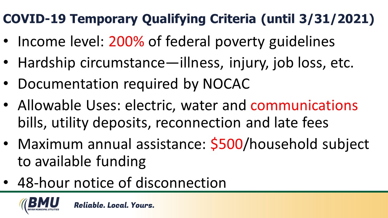 BMU customers qualify based on the federal income guidelines or exceptional hardship circumstances. The financial aid is made available only after other assistance programs have been exhausted and is capped at $250 per household per year. If you, or someone you know, needs help with his or her utility bills, please contact NOCAC at 419-636-4924.