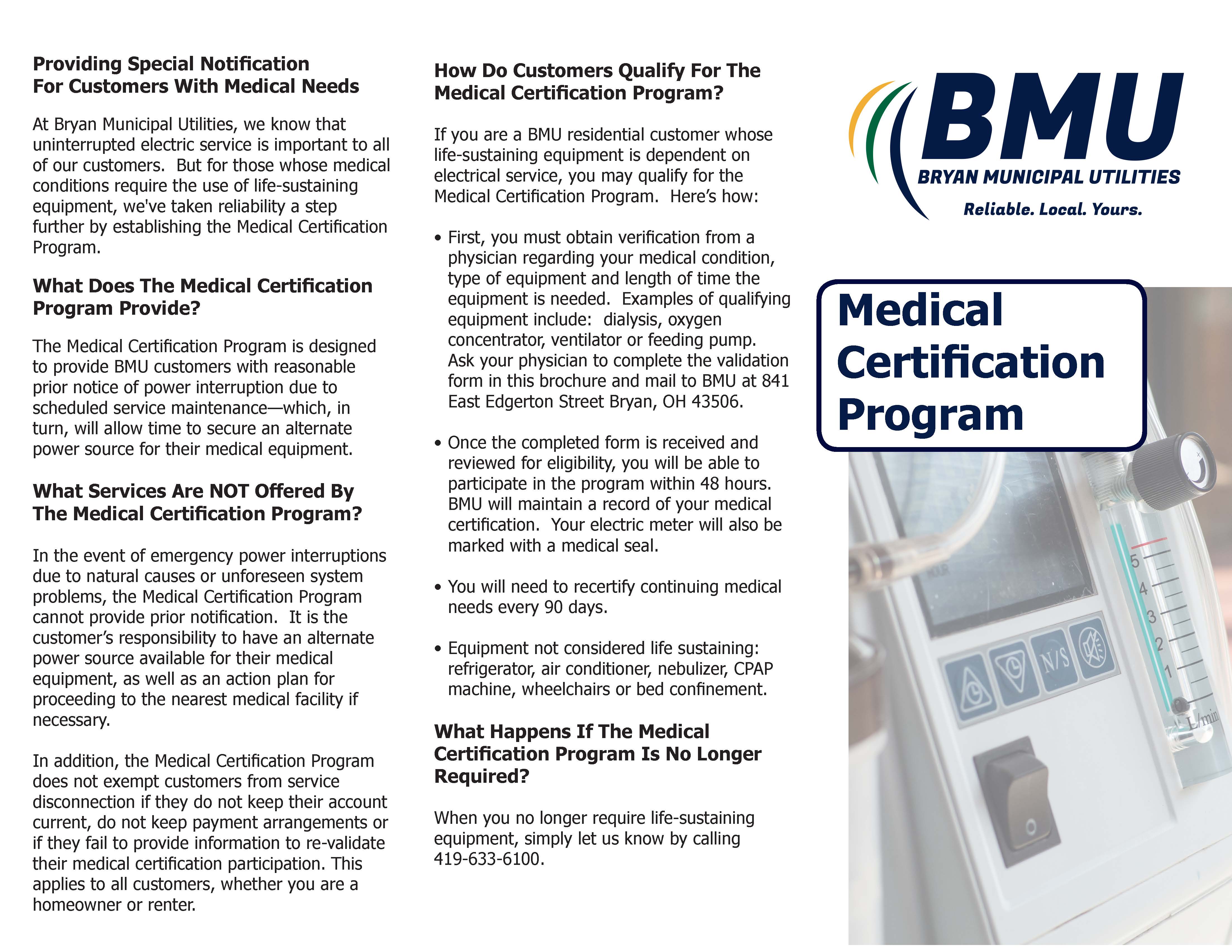 The Medical Certification Program is designed to provide BMU customers with reasonable prior notice of power interruption due to scheduled service maintenance—which, in turn, will allow time to secure an alternate power source for their medical equipment.