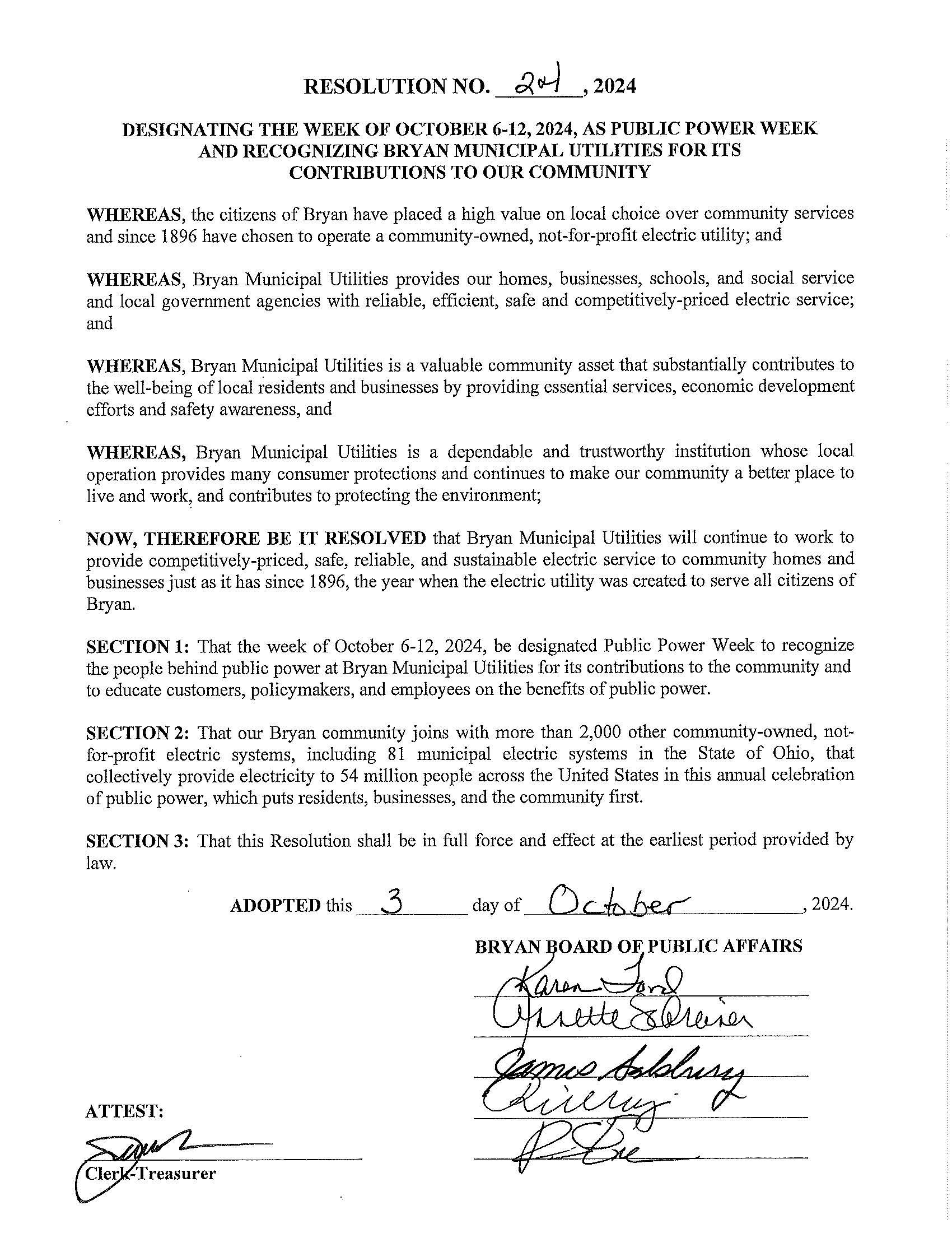 A resolution was passed at last Thursday’s Bryan Board of Public Affairs meeting designating the week of October 9-12, 2024, as PUBLIC POWER WEEK and recognizing Bryan Municipal Utilities for our contribution to our community.