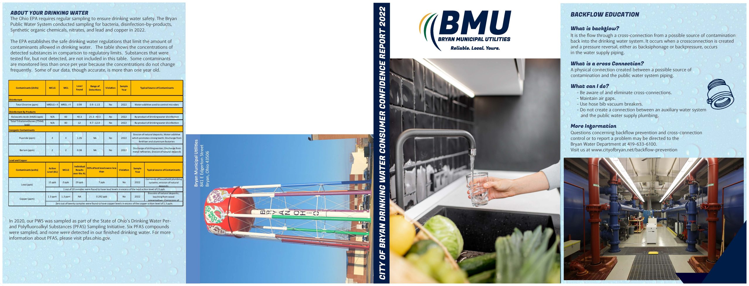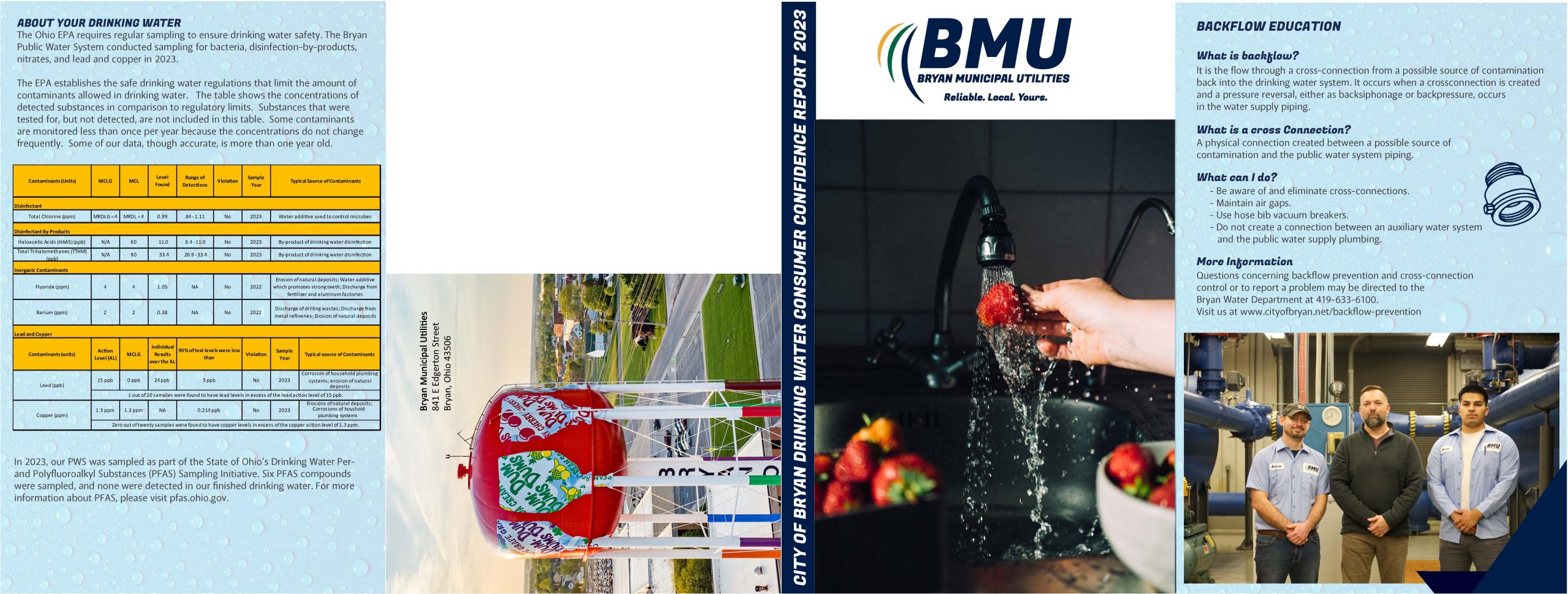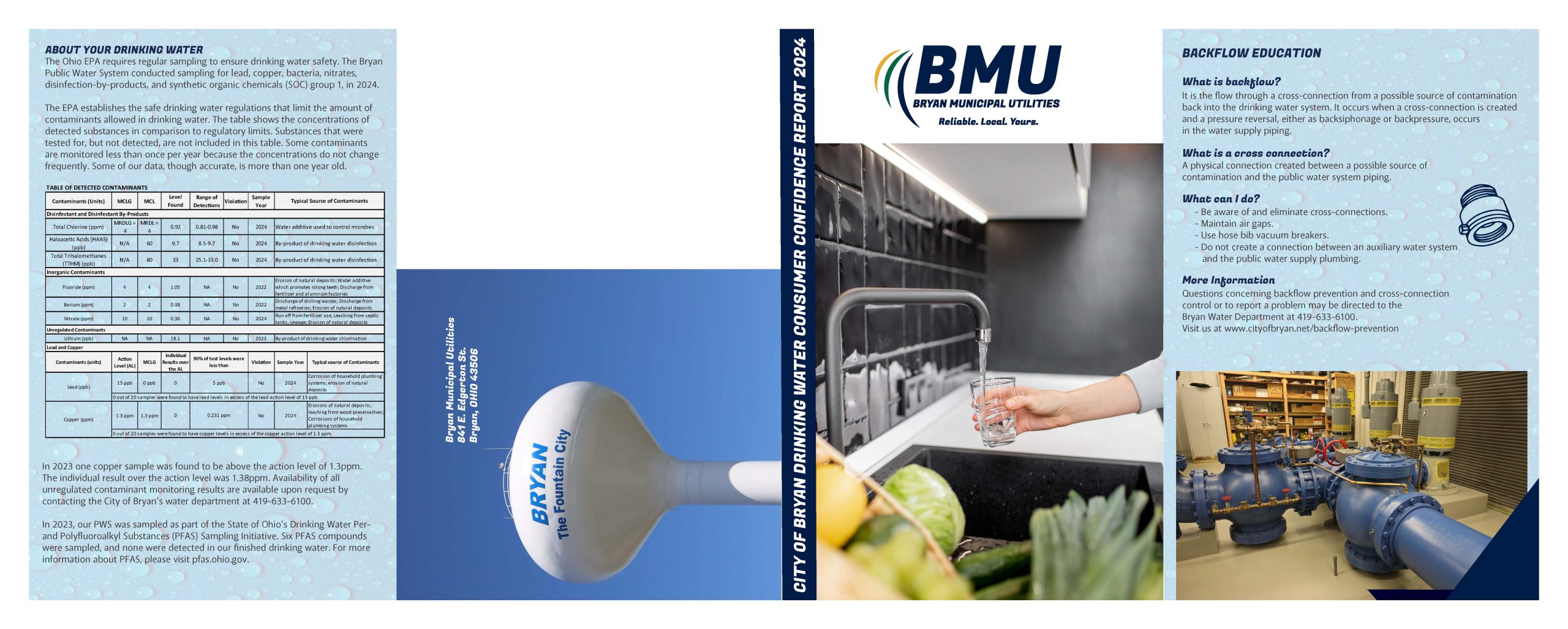 Each year, the Water Department prepares the Water Quality Report as required by the Environmental Protection Agency. Its purpose is to provide you with information about your drinking water. The quality of your drinking water is monitored every day by our state certified operators. These operators are dedicated to providing you with an ample supply of safe water. Additionally, the EPA requires continuing education for operators to maintain their certification. If you would like additional information, please contact us and we will be happy to assist you. We can be reached by phone at 419-633-6100 or by e-mail: water@cityofbryan.com
