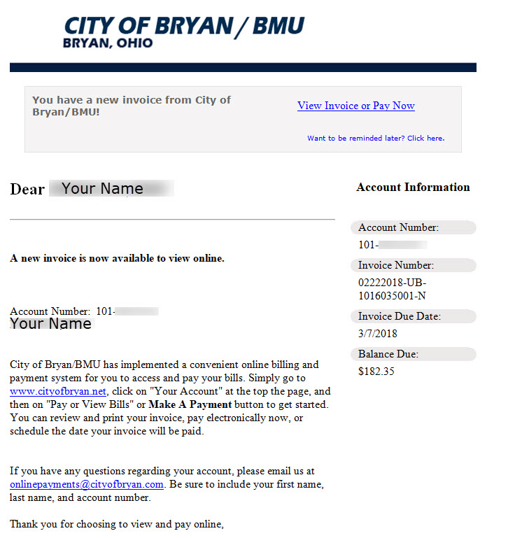 - Online payment – Utility customers now have the option of paying their utility bills with a credit card securely over the Internet. This is a safe and very convenient way to pay. Additionally, customers may select to have their utility bills emailed to them instead of having them mailed to their address. The online payment option allows you to review your current utility bill and make payments 24 hours a day, 7 days a week. We are pleased to provide this service to our customers. Just click on the Online Payments link to get started. You will need your utility account number and a valid email address to get set up. Discover, Mastercard, and Visa are accepted. This is a fee-based service. A service fee of $4.25 will be applied to all credit card and e-check transactions made for utility payments and utility deposits. There is a maximum payment amount of $400 for credit card payments and a maximum payment amount of $125,000 for e-check utility payments and utility deposits. Please contact the Clerk-Treasurer’s office at 419-633-6020 or email at onlinepayments@cityofbryan.com if you have any questions.